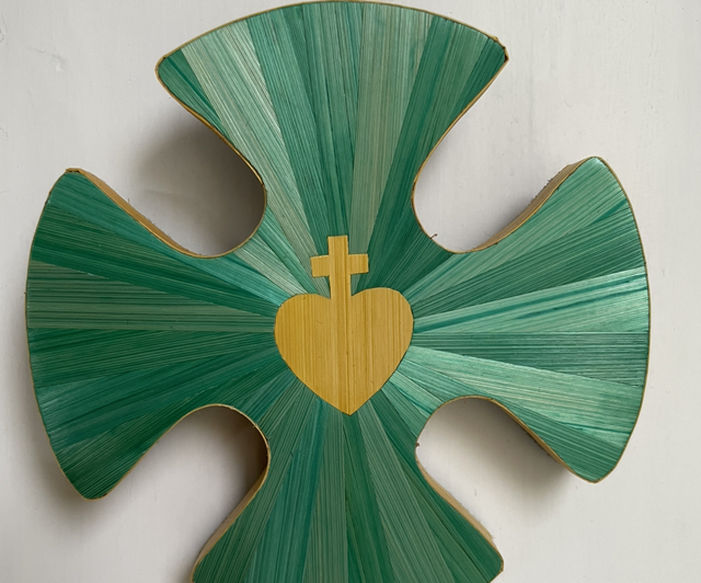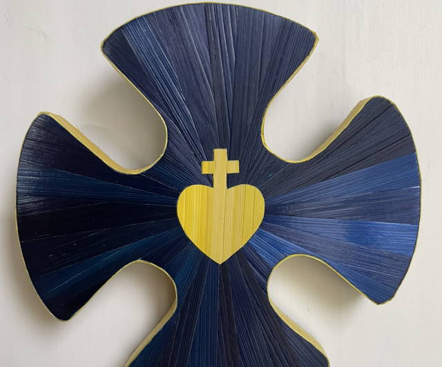 Croix de diamètre 10 cm en marqueterie de paille - incrustation du Sacré Coeur